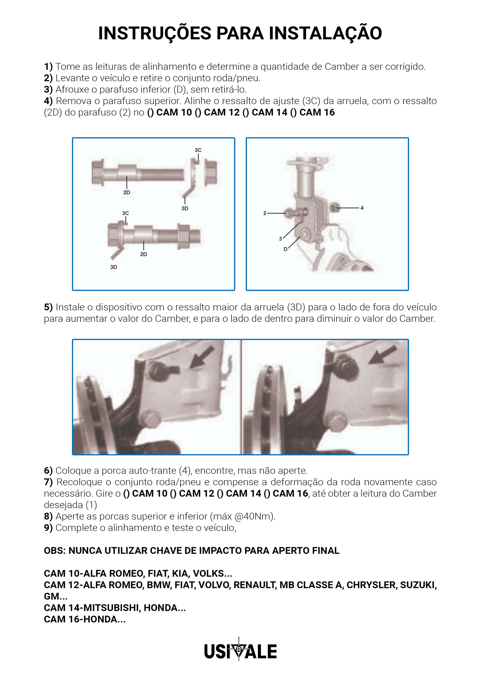 Aplicação: Utilizada para corrigir o ângulo de Camber em até 1º 45’ para positivo ou negativo (dependendo do veículo) pela substituição do parafuso superior, em suspensões que usam amortecedores com 2 (dois) parafusos na base.